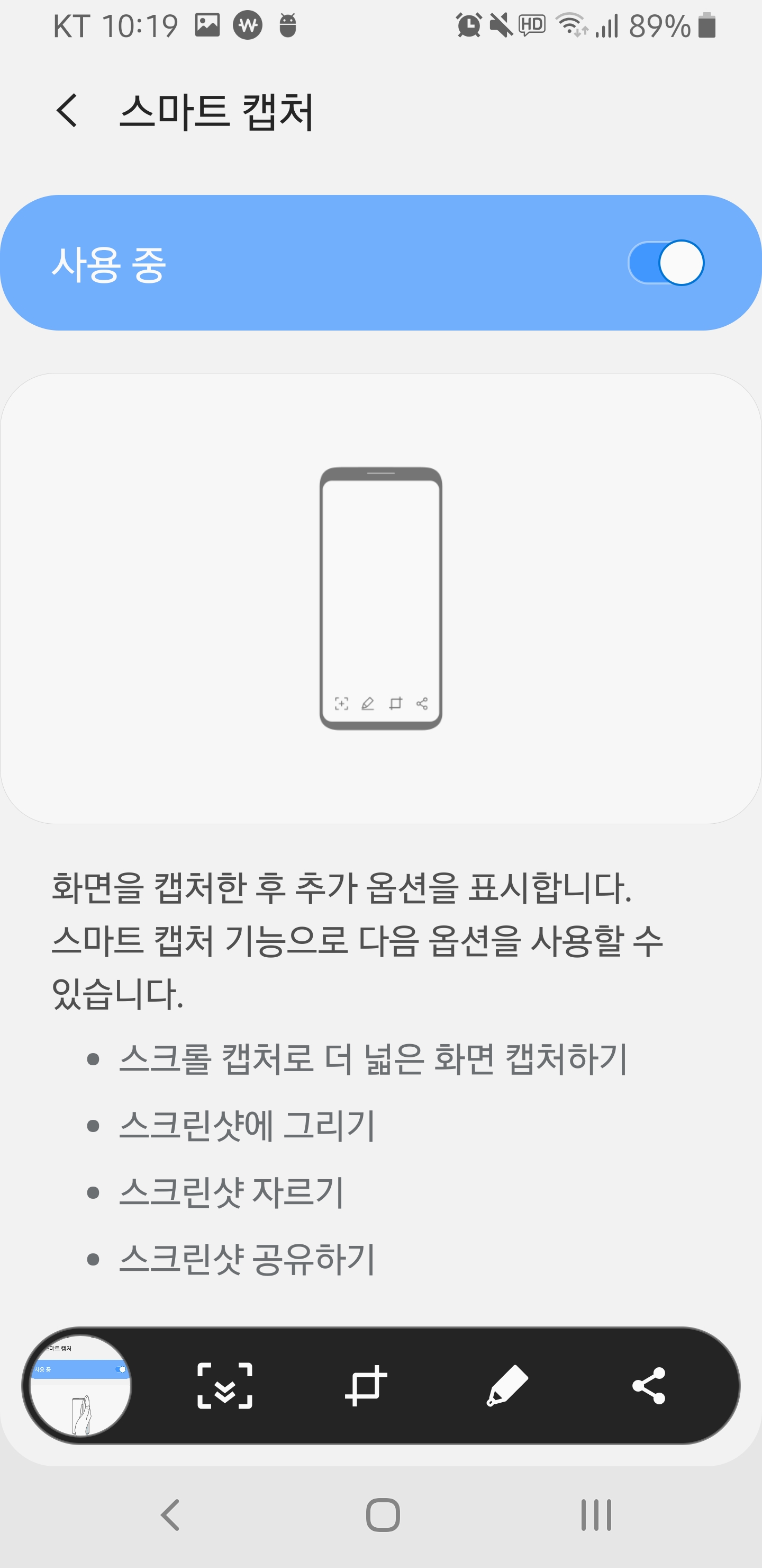 스마트 캡처기능 켜게 되면 화면캡처가 이루어진뒤 하단에 추가적인 액션을 사용할 수 있게 되는데 「∨」 아이콘을 통해 자동 스크롤을 하면서 추가 영역이 캡처되게 됩니다. 이 버튼을 연속적으로 누르게 되면 화면 스크롤 되는 모든 컨텐츠 영역을 하나의 이미지로 캡처할 수 있습니다.