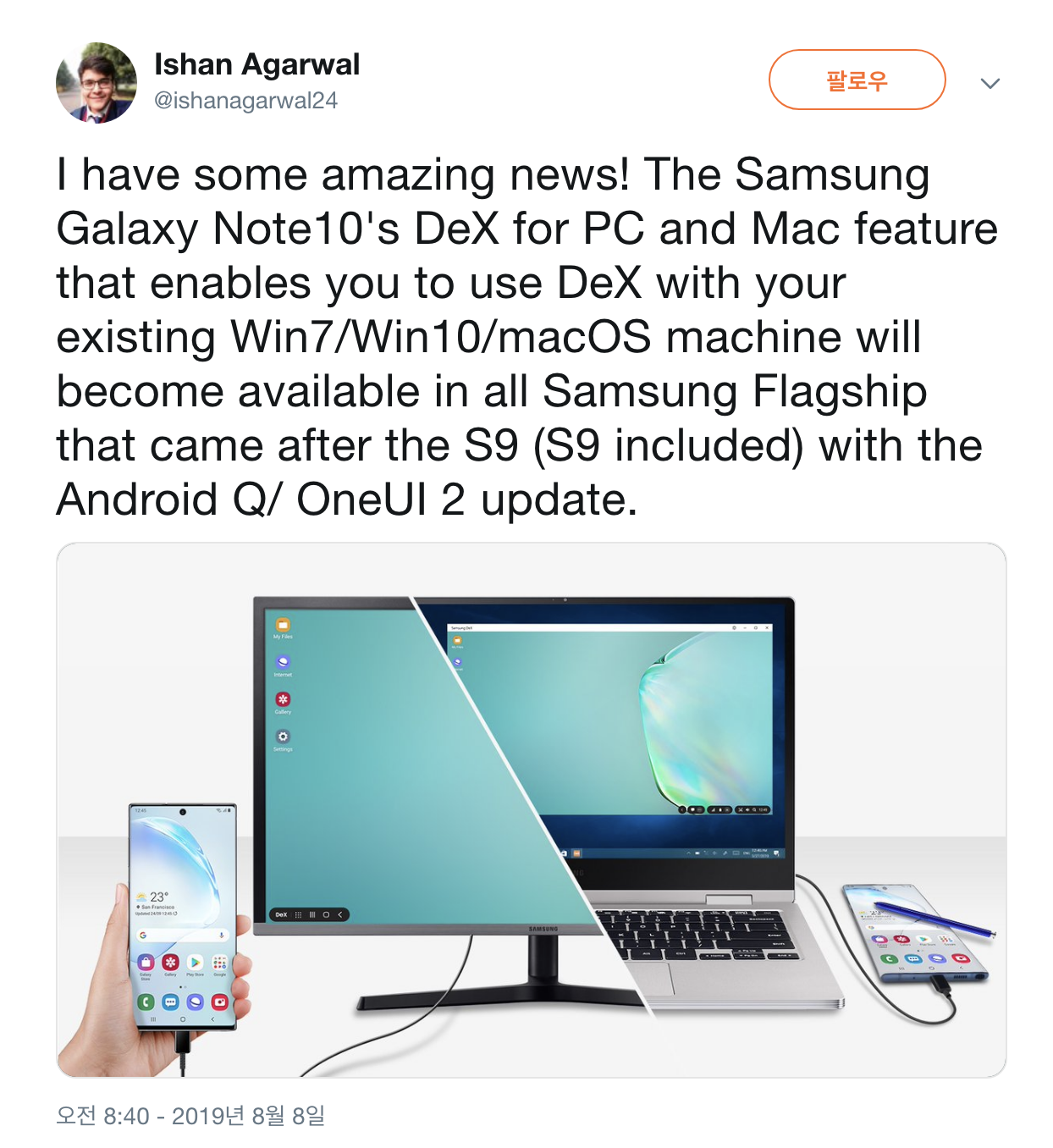 Ishan Agarwal는 트윗을 통해 약간의 루머성 이야기를 하였는데요. DeX for PC기능은 갤럭시 S9이후 모델에서도 지원할것이며, Android Q/OneUI 2 업데이트 시점으로 내다봤습니다.