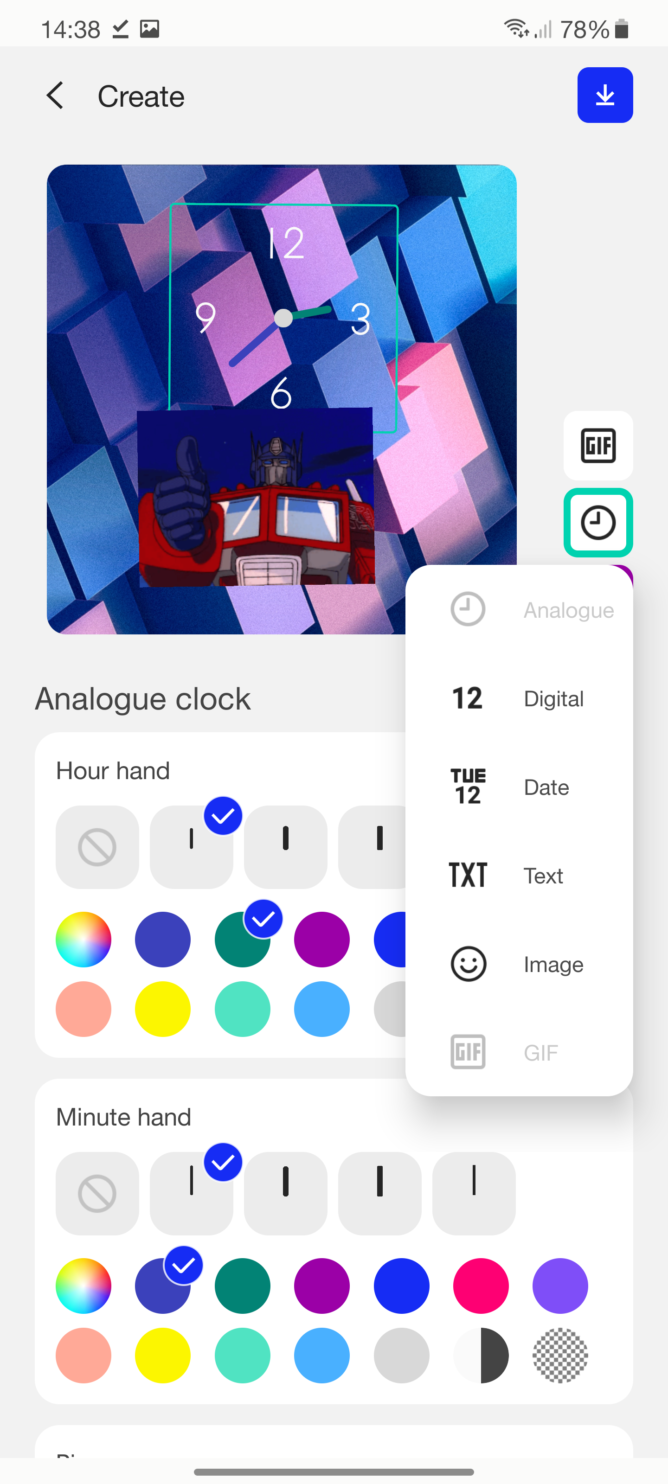ClockFace는 가장 큰 업데이트가 진행됐습니다. 오래된 시계 스타일과 함께 사용자 정의의 새로운 시계 스타일이 추가됐습니다. 기본 설정이 마음에 들지 않으면 직접 만들 수 있습니다. 색상, 손 유형, 형식을 선택하고 이미지와 gif를 추가할수 있습니다.