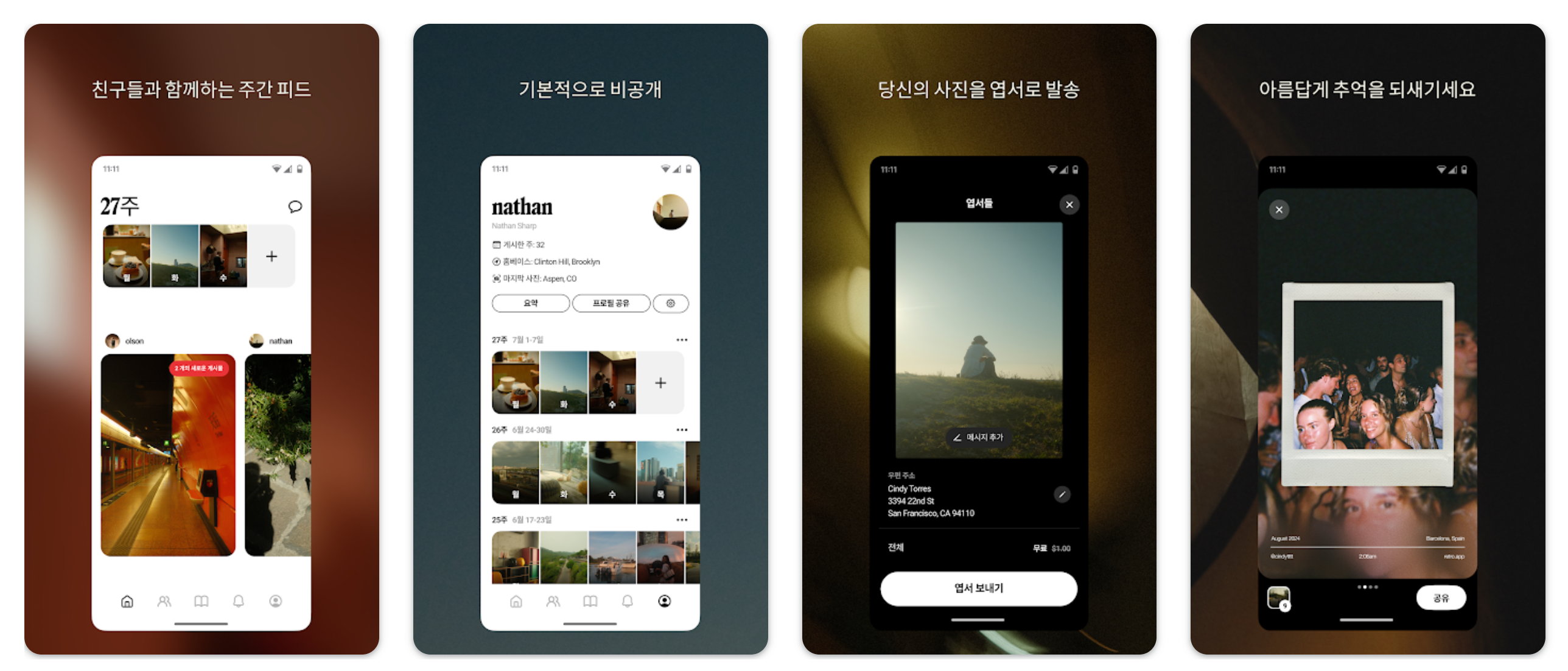 Retro는 하루하루의 소중한 순간을 사진과 함께 기록할 수 있는 ‘주간 사진 일기’ 앱이다. 일상을 사진으로 남기고, 한 주를 정리해보는 습관을 자연스럽게 만들어준다^7^6. - 친구와의 프라이빗 공유